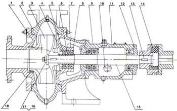 本型快猫成人APP主要由:泵盖(1),泵体(2),叶轮(3),轴(15),轴封体(4),轴承箱(11))及联轴器部件等组成〈见图1:结构图〉